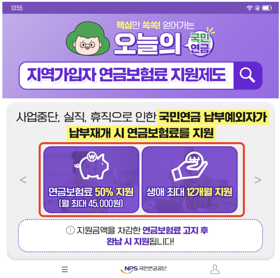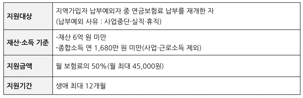 사업중단, 실직, 휴직으로 인한 납부예외자가 납부재개 시, 생애 최대 12개월까지 연금보험료 50%를 지원한다고 한다. 월 최대 지원금액은 45,000원이라고 한다.