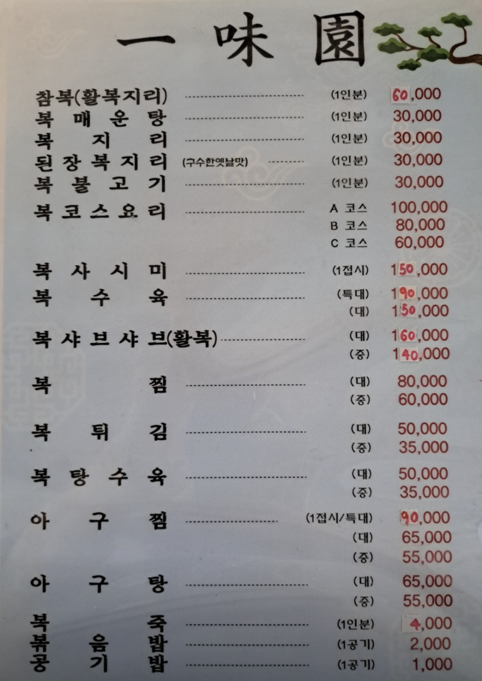 대부분의 손님이 단골 이신듯 하다. 수십년은 될법한 정원의 소나무와 안마당의 넓은 주차장. 엄청 넓은 집이었던것으로 추측되는 일미원의 건물은 오랜 기간만큼이나 추억도 많을듯. 편하게 먹고 마실수 있는 요리 집 느낌이고, 임직원 모두 오랫동안 근무한것으로 보여서 더욱더 프렌들리하고 편안하고 여유있다. 막걸리 복분자등 주종도 다양해서 친구 또는 가족들과 복요리를 다양하게 먹기에 좋을곳으로 보여진다.