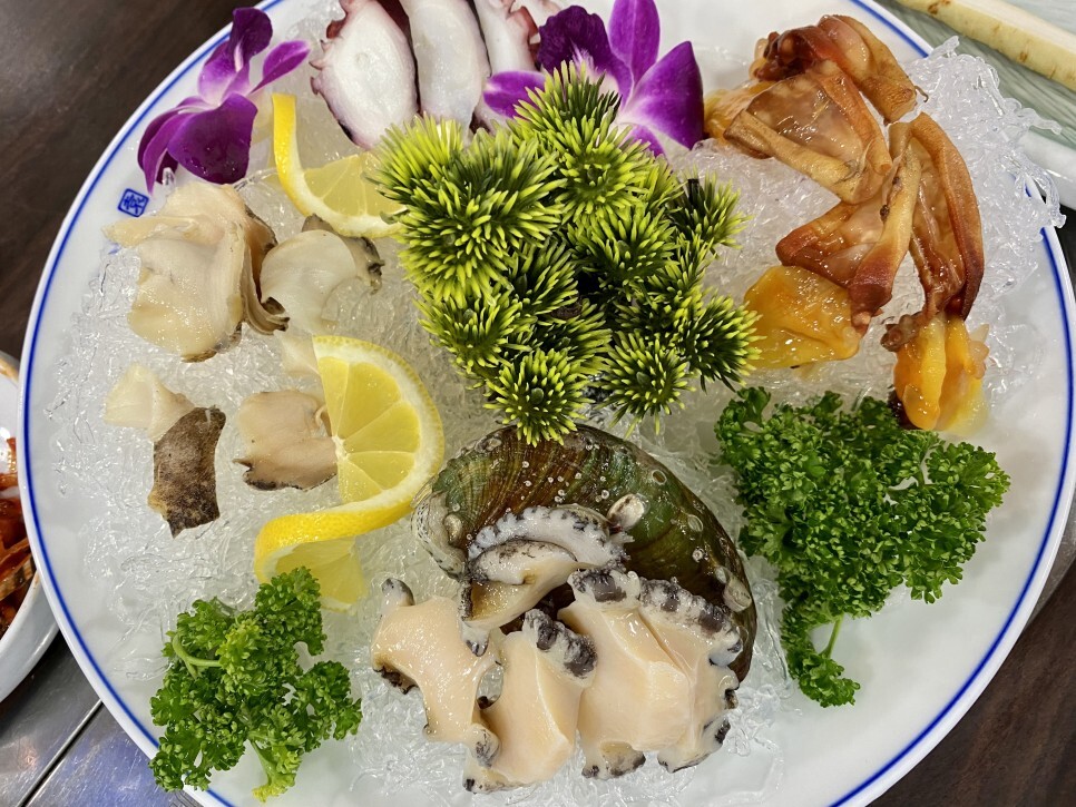 해산물 모듬 - 전복이 크고 매우 실하다. 멍게 향 좋고 문어 쫄깃 하얀 골뱅이 부드럽고. 다 좋다. 막걸리 바로 시킴.